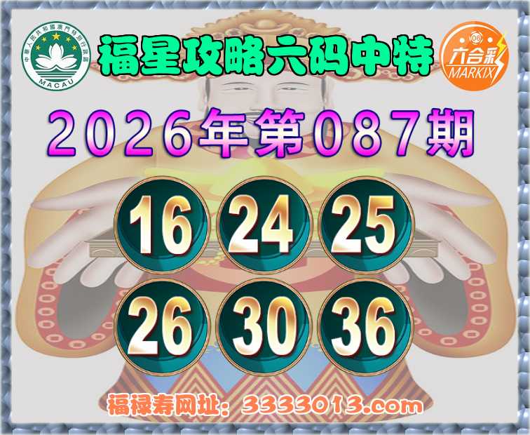 087期:【福星攻略】 🧏‍♀️六码中特🧏‍♀️【16.24.25.26.30.36】开:26