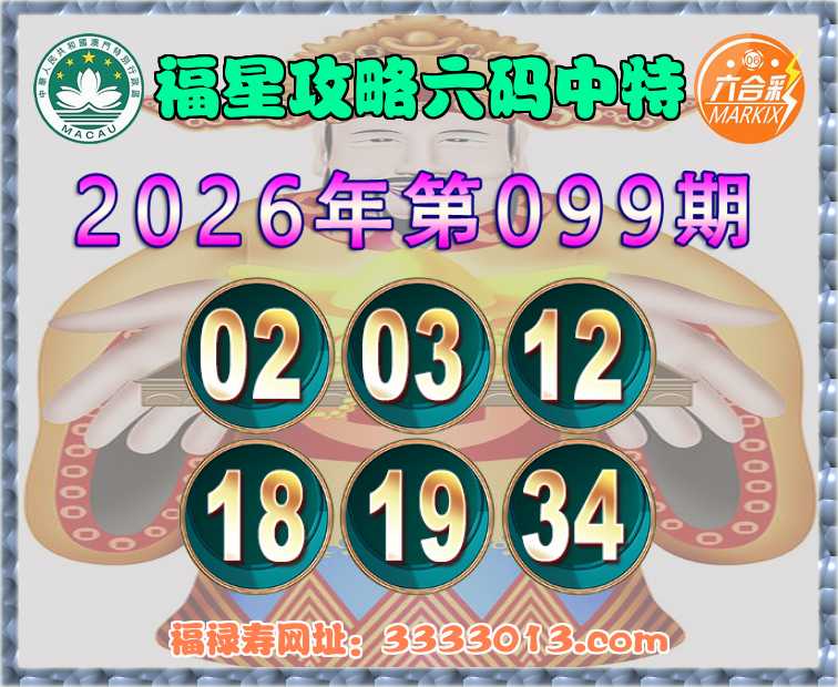 099期:【福星攻略】 🧏‍♀️六码中特🧏‍♀️【02.03.12.18.19.34】开:12