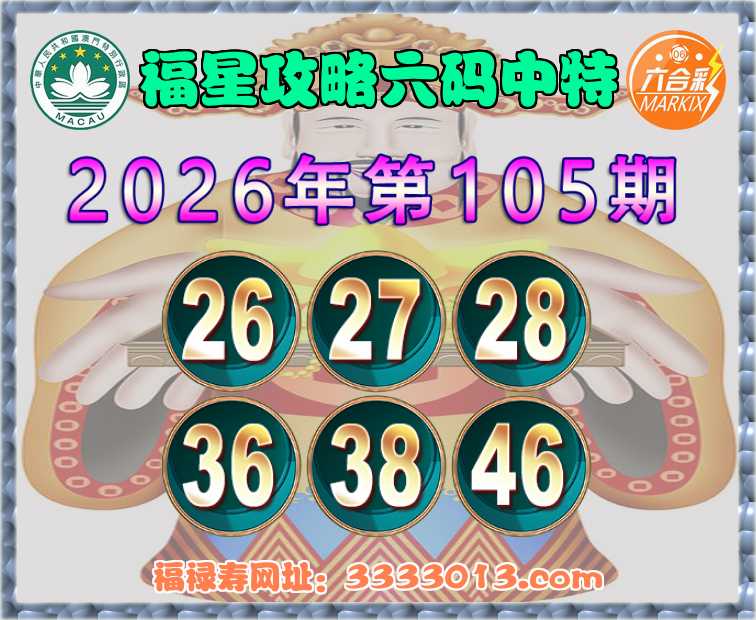 105期:【福星攻略】 🧏‍♀️六码中特🧏‍♀️【26.27.28.36.38.46】开:28
